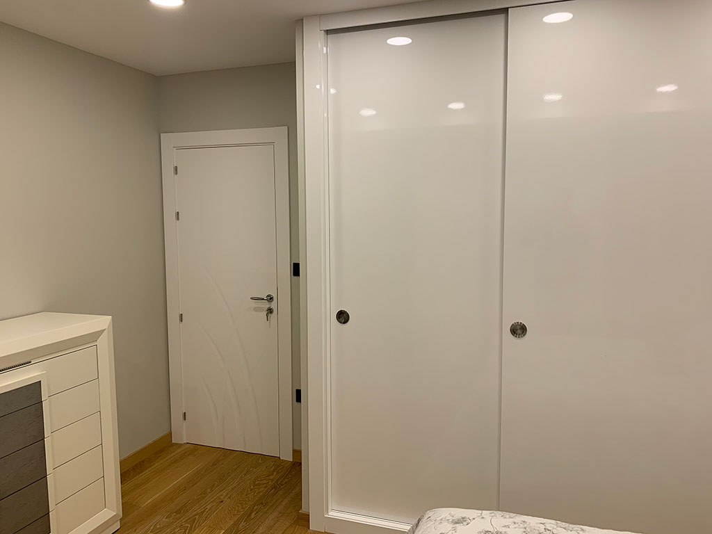 Armario empotrado a medida con puertas correderas lacadas en alto brillo.